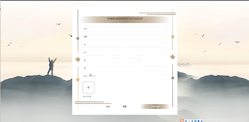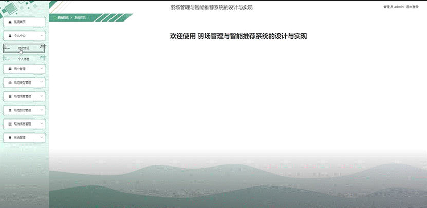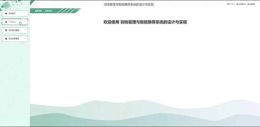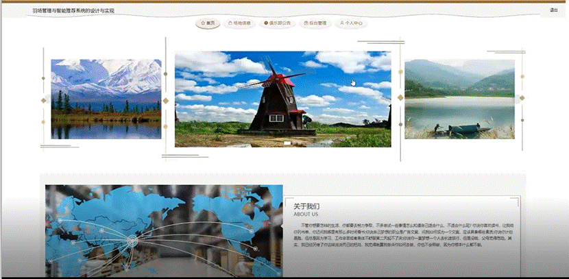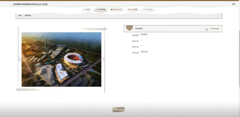 当人们打开系统的网址后,首先看到的就是首页界面。在这里,人们能够看到羽场管理与智能推荐系统的导航条,通过导航条导航进入各功能展示页面进行操作。系统首页界面如图5-1所示: