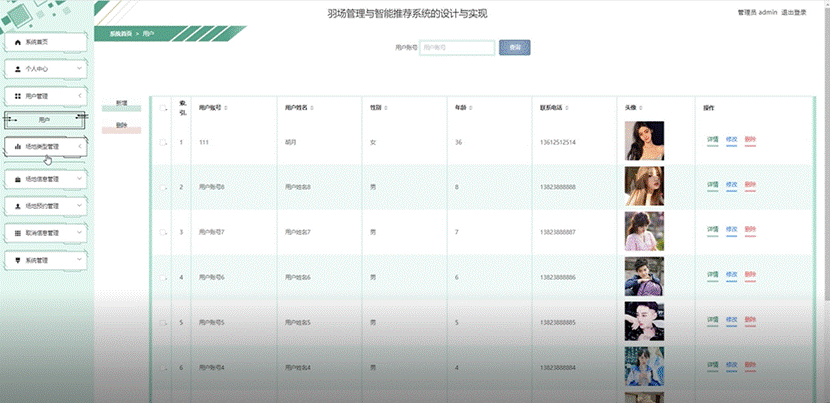 管理员点击用户管理。在用户页面输入用户账号进行查询、新增或删除用户列表,并根据需要对用户详情信息进行详情、修改或删除操作;如图5-7所示: