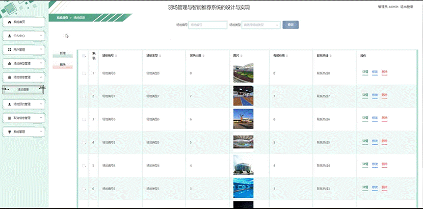 管理员点击场地信息管理。在场地信息页面输入场地编号、场地类型进行查询、新增或删除场地信息列表,并根据需要对场地详情信息进行详情、修改或删除操作;如图5-9所示: