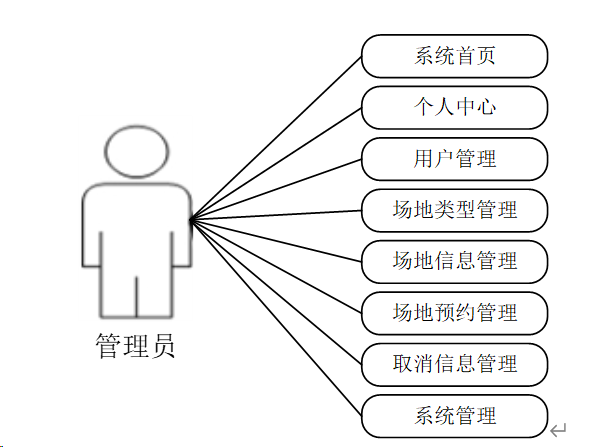 (1)、管理员关键功能包括系统首页、个人中心、用户管理、场地类型管理、场地信息管理、场地预约管理、取消信息管理、系统管理等进行管理。管理员用例如下: