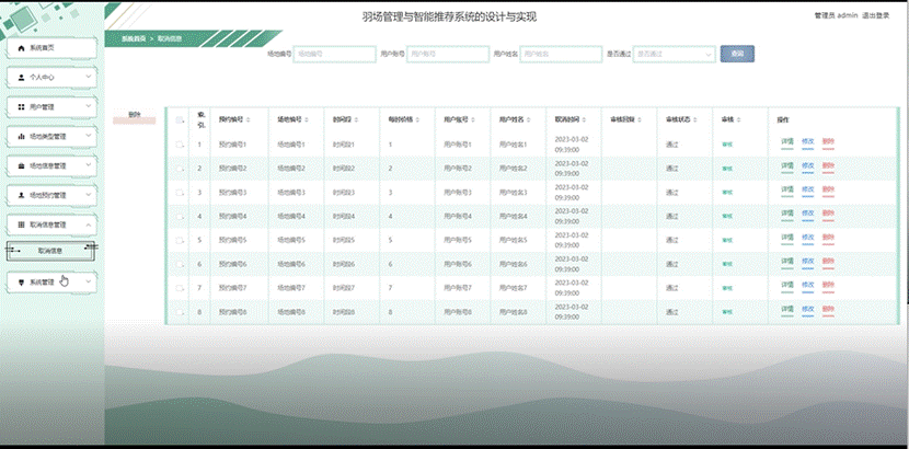 管理员点击取消信息管理。在取消信息页面输入场地编号、用户账号、用户姓名和选择是否通过进行查询或删除取消信息列表,并根据需要对取消详情信息进行详情、修改或删除操作;如图5-11所示: