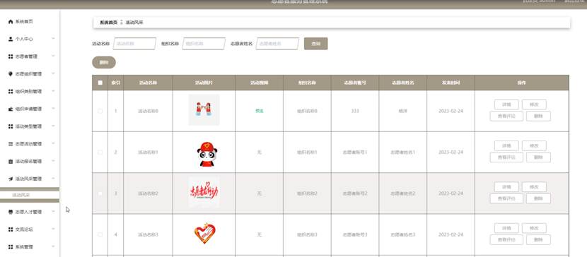 管理员点击活动风采管理。进入活动风采页面输入活动名称、组织名称和志愿者姓名可以查询,新增或删除活动风采列表,并对活动风采详细信息进行查看详情、修改、查看评论和删除等操作。如图5-10所示: