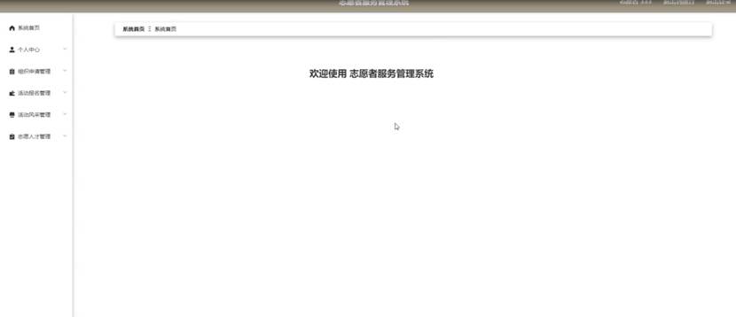 志愿组织进入主页面,主要功能包括对系统首页、个人中心、志愿组织管理、组织申请管理、志愿活动管理、活动报名管理、活动风采管理、系统管理等功能进行操作。