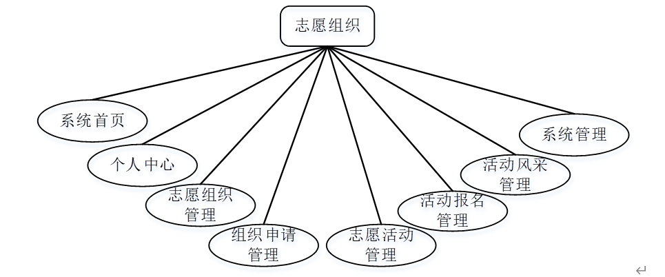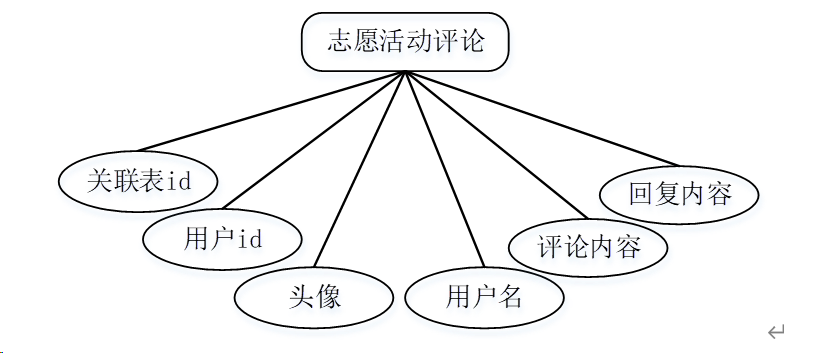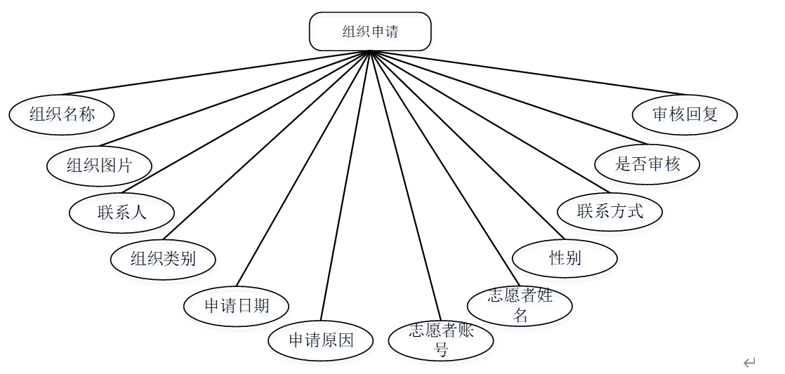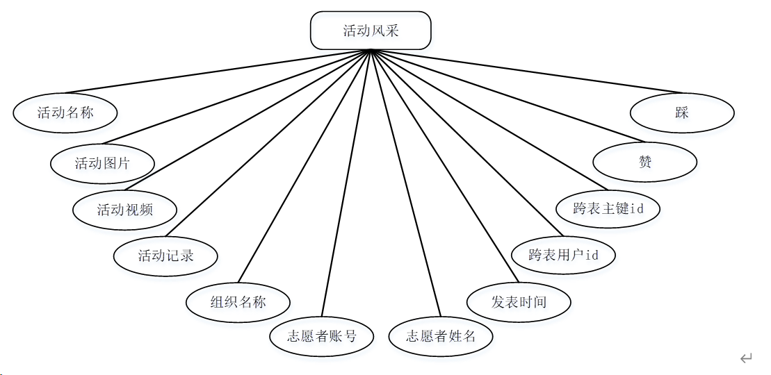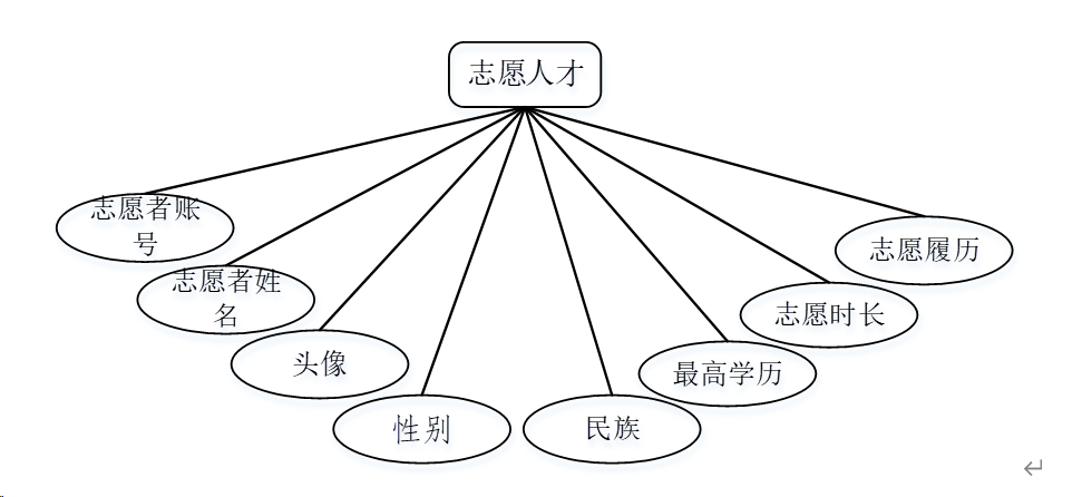 通过对志愿者服务管理系统的主要功能信息进行规划并分为若干功能实体信息,实体信息将使用E-R图加以表示,本系统的主要功能实体图如图4-2、图4-3、图4-4、图4-5、图4-6所示。