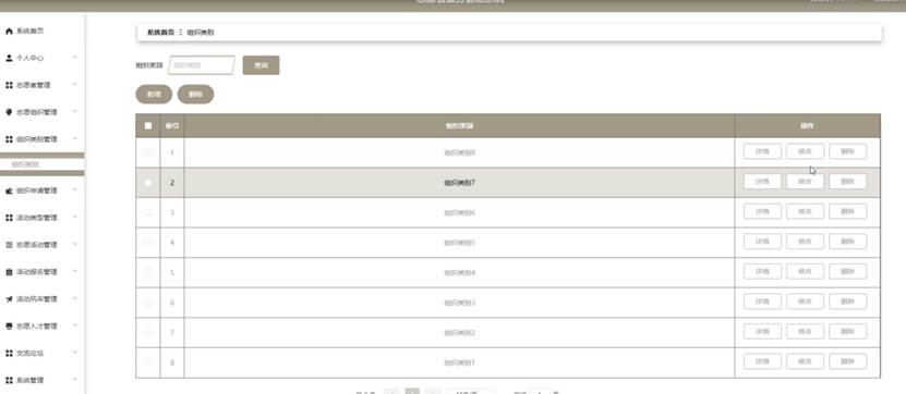 管理员点击组织类别管理。进入组织类别页面组织类别可以查询,新增,删除或打印组织类别信息,并对组织类别详细信息进行查看详情,修改和删除等操作。如图5-9所示:
