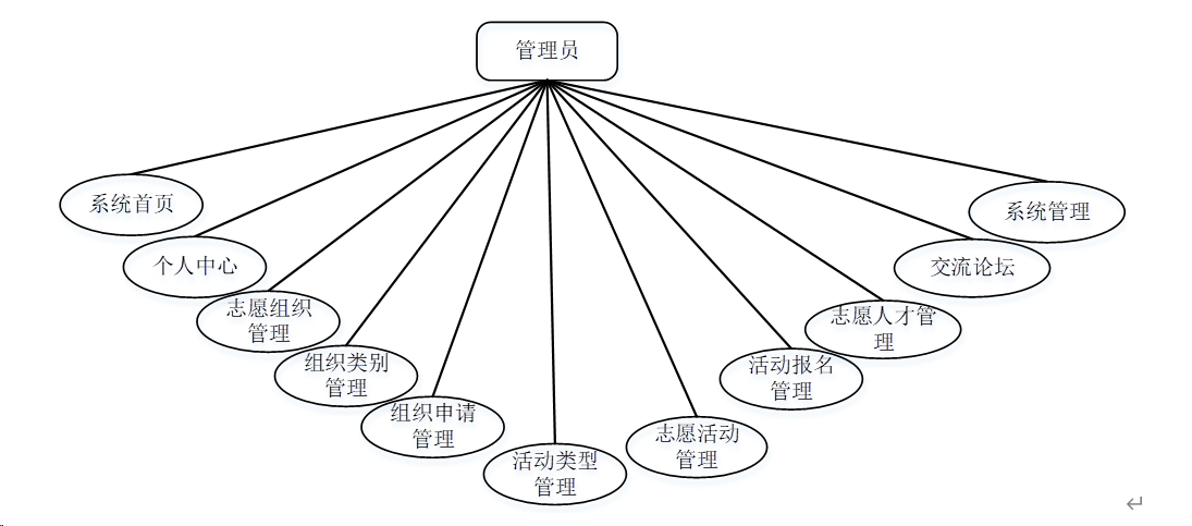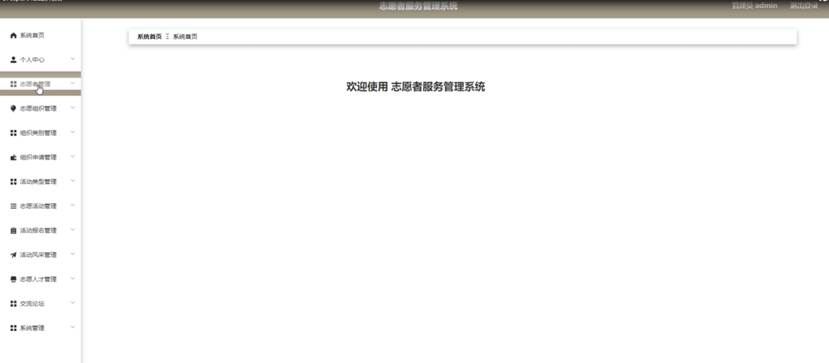 管理员进入主页面,主要功能包括对系统首页、个人中心、志愿组织管理、组织类别管理、组织申请管理、活动类型管理、志愿活动管理、活动报名管理、志愿人才管理、交流论坛、系统管理等进行操作。
