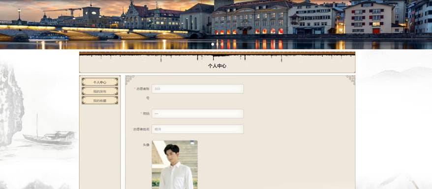 在个人中心页面可以更新个人详细信息,并在我的发布和我的收藏页面对志愿者服务信息进行操作;如图5-4所示:
