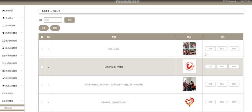 管理员点击系统管理,进入通知公告页面输入标题进行查询、新增或删除通知公告列表,并对通知公告详细信息进行详情、修改或删除操作;还可以对轮播图管理和系统简介进行详细操作,如图5-12所示: