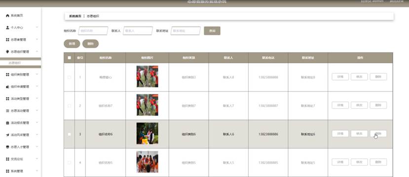 管理员点击志愿组织管理。进入志愿组织页面输入组织名称、联系人和联系地址可以查询,新增或删除志愿组织信息,并志愿组织详细信息进行查看详情、修改和删除等操作。如图5-8所示: