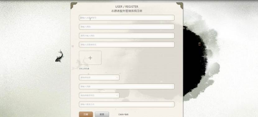 志愿者进入主页面,主要功能包括对系统首页、个人中心、组织申请管理、活动报名管理、活动风采管理、志愿人才管理等功能进行操作。