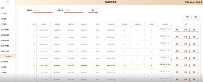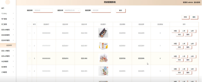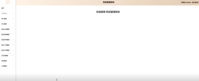 管理员登录系统后,可以对首页、个人中心、用户管理、员工管理;药品分类管理、药品信息管理、药品库存管理、药品入库管理、药品出库管理、供应商管理、系统管理、订单管理等功能进行相应操作,如图5-6所示。