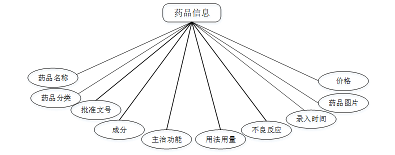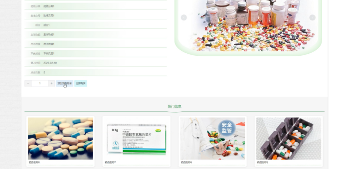 用户点击药品信息;在药品信息页面的搜索栏输入药品名称、类别、批准文号,进行查询,然后查看药品名称、药品分类、批准文号、成分、主治功能、用法用量、不良反应、药品图片、价格、不良反应等信息,也可以添加到购物车、立即购买或者收藏等操作;如图5-3所示。