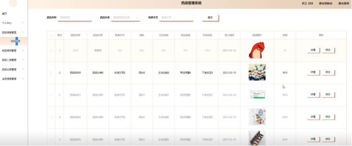 员工点击药品信息管理;在药品信息管理页面查看药品名称、药品分类、批准文号、成分、主治功能、用法用量、不良反应、录入时间、药品图片、价格等信息,进行查询,如图5-17所示。