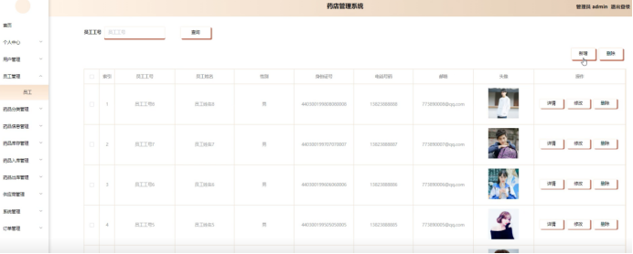 管理员点击员工管理;在员工管理页面对员工工号、员工姓名、性别、身份证号、电话号码、邮箱、头像等信息,进行查询,新增或删除员工信息等操作;如图5-8所示。