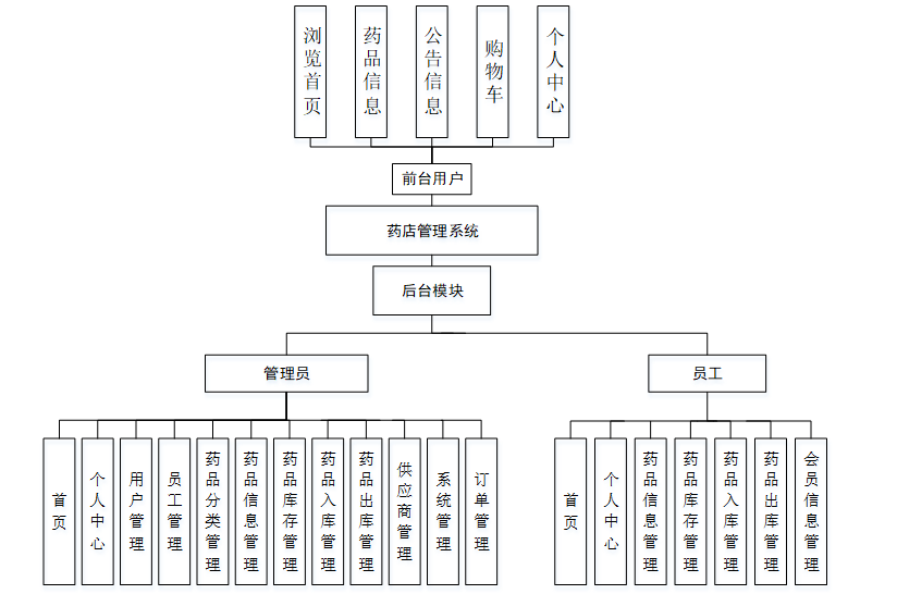 药店管理系统采用了结构化开发的方法。这种开发方法的优点是控制性比较强,开发过程中采用了结构化和模块化的设计思想,自顶向下,从总体到部分,合理划分系统的结构和模块[11]。结构化开发时使用模块式开发,各模块之间互不影响,方便系统的开发与管理。 网站总体功能如下图所示: