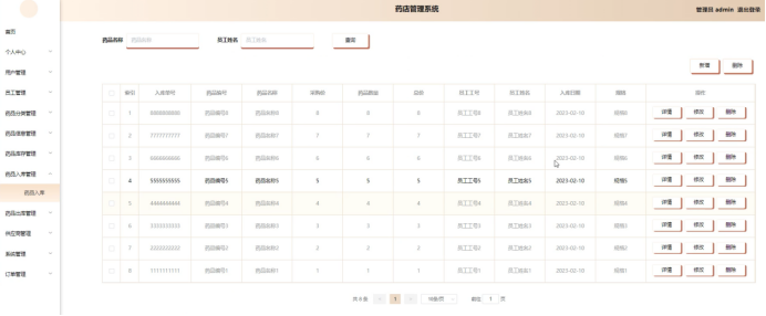 管理员点击药品入库管理;在药品入库管理页面对入库单号、药品编号、药品名称、采购价、药品数量、总价、员工工号、员工姓名、入库日期、规格等信息,进行查询、新增或删除药品入库等操作;如图5-12所示。