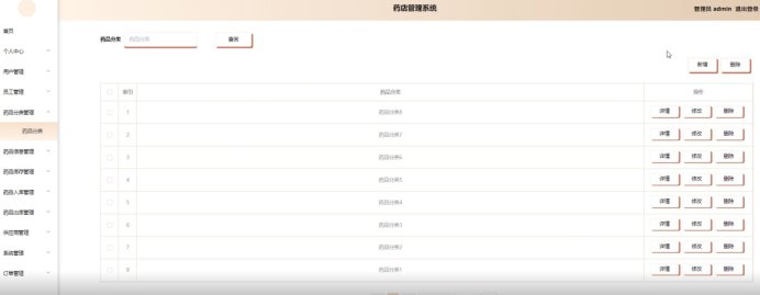 管理员点击药品分类管理;在药品分类管理页面对药品分类等信息,进行查询或新增、删除药品分类等操作;如图5-9所示。