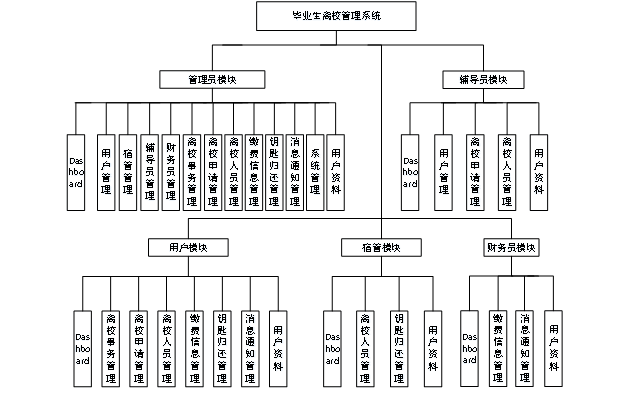 管理员端的功能主要是开放给系统的管理人员使用,能够对用户的信息进行管理,包括对用户管理、宿管管理、辅导员管理、财务员管理、离校事务管理、离校申请管理、离校人员管理、缴费信息管理、钥匙归还管理、消息通知管理、系统管理进行查看,修改和删除、新增等,对系统整体运行情况进行了解。