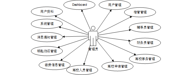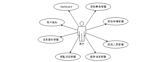 用户的功能主要是对个人账号和密码进行更新管理,对Dashboard、离校事务管理、离校申请管理、离校人员管理、缴费信息管理、钥匙归还管理、消息通知管理、用户资料进行查询详情操作。