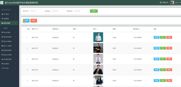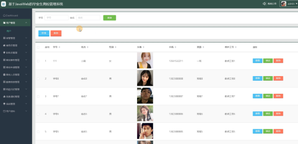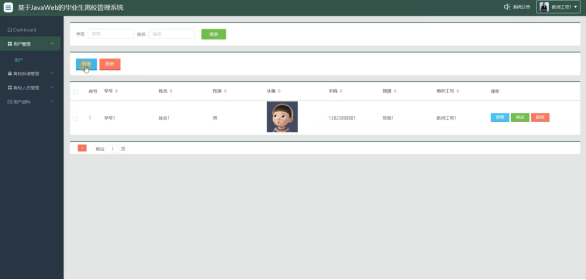 辅导员点击用户管理,在用户管理页面,对学号、姓名、性别、头像、手机、班级、教师工号等内容,进行索搜或新增,用户列表等操作,如图5-15所示。