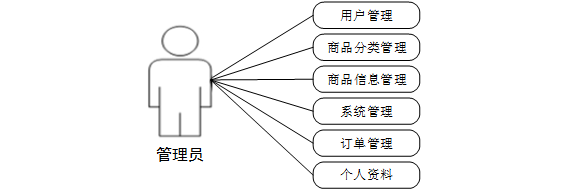 (1)管理员关键功能包含用户管理、商品分类管理、商品信息管理、系统管理、订单管理、个人资料等进行管理。管理员用例如下: