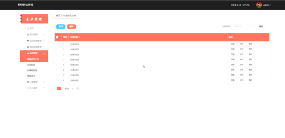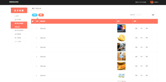 商品分类管理;在商品分类管理页面输入账号、姓名进行搜索、新增或删除商品分类管理列表,并对商品分类管理详细信息进行查看、修改或删除操作;如图5-9所示: