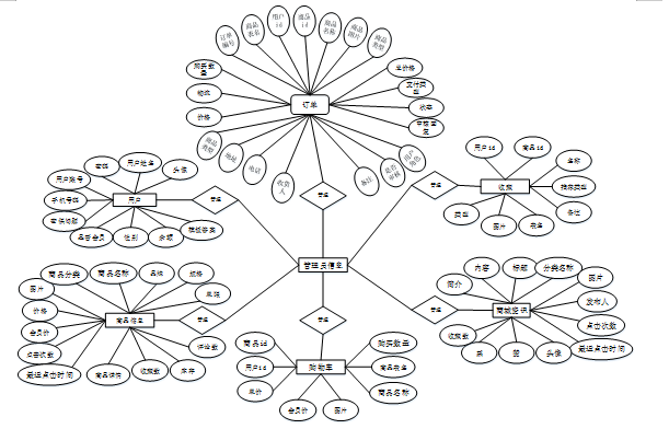根据功能需求来对系统的e-r图来进行分解得到几种实体,在系统中将“用户、订单、商品信息、商城资讯、购物车、收藏”等作为实体,它们的局部E-R如图4-2所示。