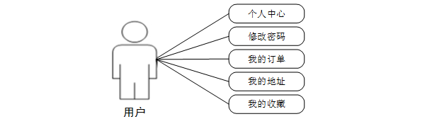 (2)用户关键功能包含个人中心、修改密码、我的订单、我的地址、我的收藏等进行管理。用户用例如下: