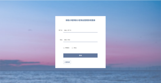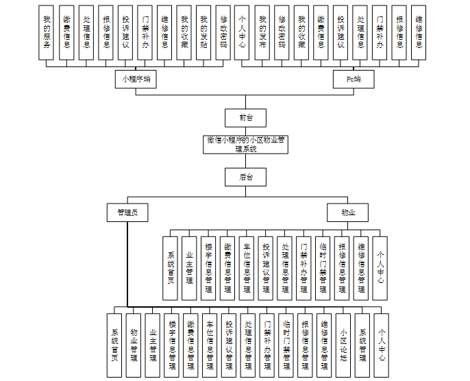 该系统由个人管理员、物业和业主三部分组成。其中:业主可在小程序端浏览楼宇信息、车位信息、小区论坛;注册登录后在我的页面可以对我的服务、缴费信息、处理信息、报修信息、投诉建议、门禁补办、维修信息、我的收藏、我的发贴、修改密码进行详细操作;业主可在Pc端浏览楼宇信息、车位信息、小区论坛、小区公告;注册登录后在我的页面可以对个人中心、我的发布、修改密码、我的收藏、缴费信息、投诉建议、处理信息、门禁补办、报修信息、维修信息进行详细操作;物业进入系统可以实现业主管理、楼宇信息管理、缴费信息管理、车位信息管理、投诉建议管理、处理信息管理、门禁补办管理、临时门禁管理、报修信息管理、维修信息管理、个人中心等功能;管理员则是根据不同需求设置了不同功能,可以通过后台管理接口管理物业信息和业主信息。