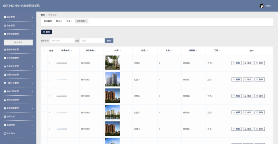 物业功能在视图层(view层)进行交互,比如点击“查询、添加或删除”按钮或填写物业信息表单。这些物业表单动作被视图层捕获并作为请求发送给相应的控制器层(controller层)。控制器接收到这些请求后,调用服务层(service层)以执行相关的业务逻辑,例如验证输入数据的有效性和与数据库的交互。服务层处理完这些逻辑后,进一步与数据访问对象层(DAO层)交互,后者负责具体的数据操作如查看、修改或删除物业信息,并将操作结果返回给控制器。最终,控制器根据这些结果更新视图层,以便物业功能可以看到最新的信息或相应的操作反馈。物业界面如图5-11所示:
