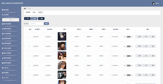 业主功能在视图层(view层)进行交互,比如点击“查询、导出、添加或删除”按钮或填写业主信息表单。这些业主表单动作被视图层捕获并作为请求发送给相应的控制器层(controller层)。控制器接收到这些请求后,调用服务层(service层)以执行相关的业务逻辑,例如验证输入数据的有效性和与数据库的交互。服务层处理完这些逻辑后,进一步与数据访问对象层(DAO层)交互,后者负责具体的数据操作如查看、修改或删除业主信息,并将操作结果返回给控制器。最终,控制器根据这些结果更新视图层,以便业主功能可以看到最新的信息或相应的操作反馈。业主界面如图5-12所示: