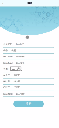 第一次使用本小程序的使用者,首先是要进行注册,点击“注册”,然后就会进入到注册的页面里面,将业主信息录入注册表,确认信息正确后,系统才会进入登录界面,业主登录成功后可使用本小程序所提供的所有功能。注册界面如图5-1所示。