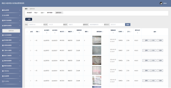 - 物业进入系统可以实现业主管理、楼宇信息管理、缴费信息管理、车位信息管理、投诉建议管理、处理信息管理、门禁补办管理、临时门禁管理、报修信息管理、维修信息管理、个人中心等功能;