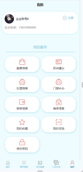 业主登录成功后,点击“我的”进入我的页面,在我的页面可以对我的服务、缴费信息、处理信息、报修信息、投诉建议、门禁补办、维修信息、我的收藏、我的发贴、修改密码等进行详细操作。业主功能界面如图5-5所示。