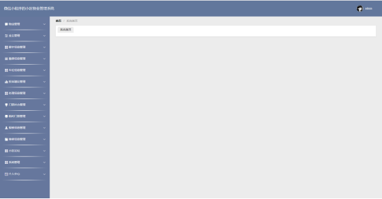 管理员进入主页面,主要功能包括对系统首页、物业管理、业主管理、楼宇信息管理、缴费信息管理、车位信息管理、投诉建议管理、处理信息管理、门禁补办管理、临时门禁管理、报修信息管理、维修信息管理、小区论坛、系统管理、个人中心等进行操作。管理员主页面如图5-10所示: