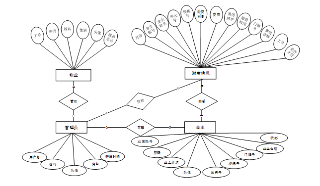 E-R图也可称为实体-联系图,其可以清楚的显示实体与实体之间的关系,是描述概念模型的有效方式,在系统中将对 “管理员、业主、物业、缴费信息”等几个主要的实体属性进行布局,如图4-2所示: