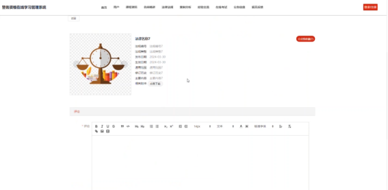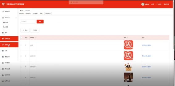 (1)功能要求:管理人员可以对个人中心、用户、法规类型、案例分类、分类、课程资料、名师精讲、学习进度、在线笔记、法律法规案例分析、在线考试管理、试题管理、留言反馈、经验交流、系统管理、考试管理等进行管理 [3]。
