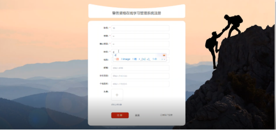 系统注册:在注册流程中,用户在Vue前端填写必要信息(如用户名、密码等)并提交。前端将这些信息通过HTTP请求发送到Java后端。后端处理这些信息,检查用户名是否唯一,并将新用户数据存入MySQL数据库。完成后,后端向前端发送注册成功的确认,前端随后通知用户完成注册。这个过程实现了新用户的数据收集、验证和存储。系统注册页面如图5-2所示:
