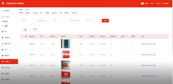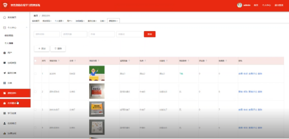 课程资料(名称、分类、封面、适用对象、作者、出版社、简介、附件、内容、评论、收藏)