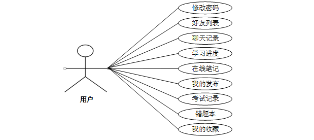 (2)用户关键功能包含修改密码、好友列表、聊天记录、学习进度、在线笔记、我的发布、考试记录、错题本、我的收藏等进行管理。用户用例如下: