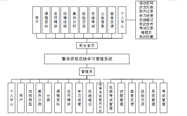 管理员模块属于是网站的后台,进入之后有大量的管理员功能,管理员也可以使用其他用户模块的功能,为了维护网站的稳定与页面的布局,将管理员模块的功能详细化后可以使用系统管理对页面进行布局修改,可以发布公告提示用户规范,警务资格在线学习管理系统总体结构如图4-2所示。
