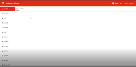 管理员进入主页面,主要功能包括对个人中心、用户、法规类型、案例分类、分类、课程资料、名师精讲、学习进度、在线笔记、法律法规案例分析、在线考试管理、试题管理、留言反馈、经验交流、系统管理、考试管理等进行操作。管理员主页面如图5-7所示: