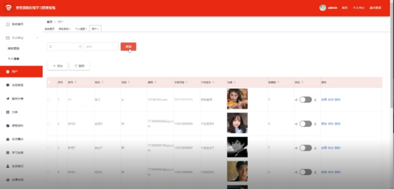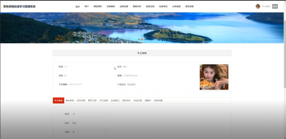 个人中心:在个人中心页面通过填写个人详细信息进行更新操作,还可以对修改密码、好友列表、聊天记录、学习进度、在线笔记、我的发布、考试记录、错题本、我的收藏进行详细操作;如图5-5所示:
