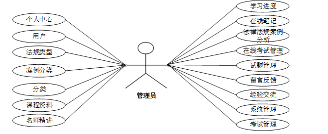 (1)管理员关键功能包含个人中心、用户、法规类型、案例分类、分类、课程资料、名师精讲、学习进度、在线笔记、法律法规案例分析、在线考试管理、试题管理、留言反馈、经验交流、系统管理、考试管理等进行管理。管理员用例如下: