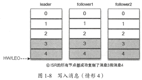 写入消息(情形4)如图1-8所示,所有的副本都成功写入了消息3和消息4,整个分区的HW和LEO都变为5,因此消费者可以消费到 offset为4的消息了。