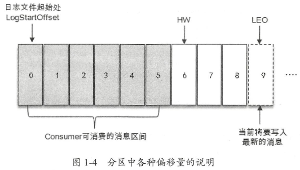如图1-4所示,它代表一个日志文件,这个日志文件中有9条消息,第一条消息的offset(LogStartOffset)为0,最后一条消息的 offset为8,offset为9的消息用虚线框表示,代表下条待写入的消息。日志文件的HW为6,表示消费者只能拉取到 offset在0至5之间的消息,