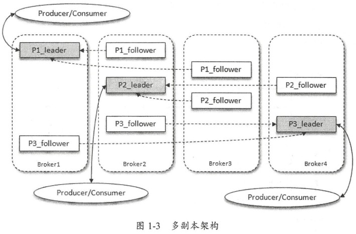 如图1-3所示, Kafka集群中有4个 broker,某个主题中有3个分区,且副本因子(即副本个数)也为3,如此每个分区便有1个 leader副本和2个 follower副本。生产者和消费者只与 leader副本进行交互,而 follower副本只负责消息的同步,很多时候 follower副本中的消息相对 leader副本而言会有一定的滞后。