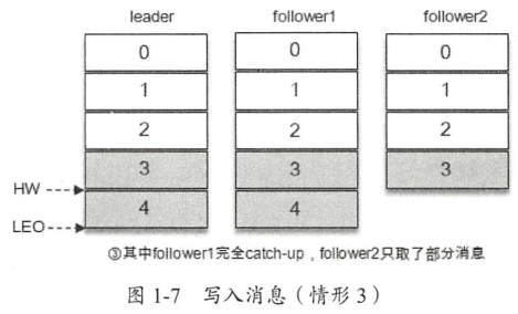在同步过程中,不同的 follower副本的同步效率也不尽相同。如图1-7所示,在某一时刻follower完全跟上了 leader副本而 follower2只同步了消息3,如此 leader副本的LEO为5,follower的LEO为5, follower2的LEO为4,那么当前分区的HW取最小值4,此时消费者可