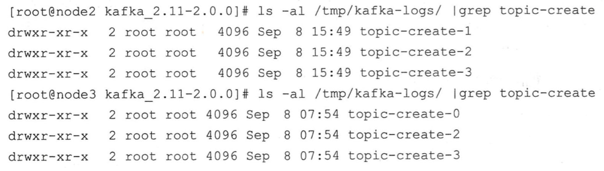 可以看到 node1节点中创建了 2 文件夹 topic-create-0 和 topic-create-1 , 对应主题 topic-create 的 2 个分区编号为 0 和 1的分区,命名方式可以概括为 <topic>-<partition>。严谨地说,其实<topic>-<partition>这类文件夹对应的不是分区,分区同主题一样是一个逻辑的概念而没有物理上的存在。并且这里我们也只是看到了 2 个分区,而我们创建的是 4 个分区,其余 2 个分区被分配到了node2和node3节点中, 参考如下: