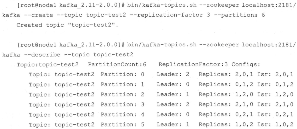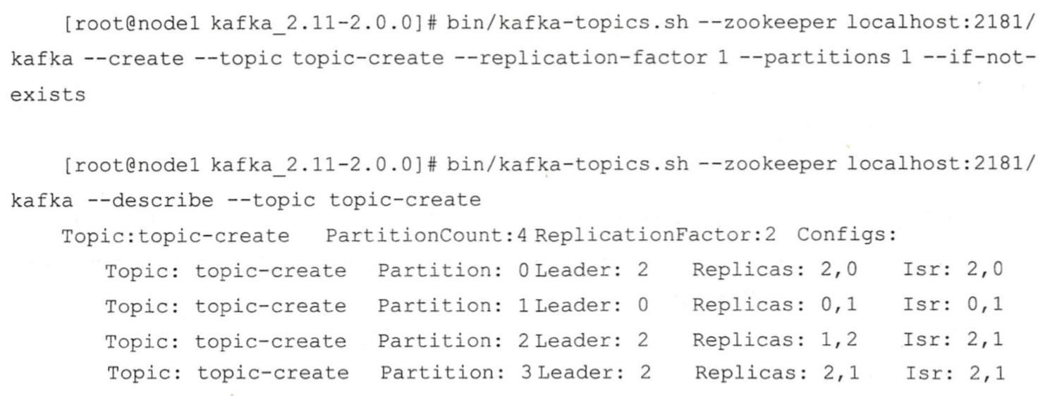 bin/kafka-topics.sh --zookeeper localhost:2181/kafka --create --topic topic-create --partitions 4 --replication-factor 2